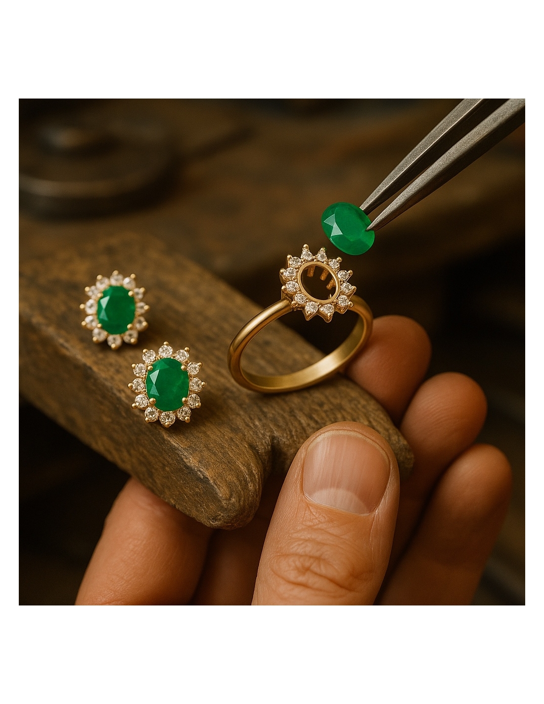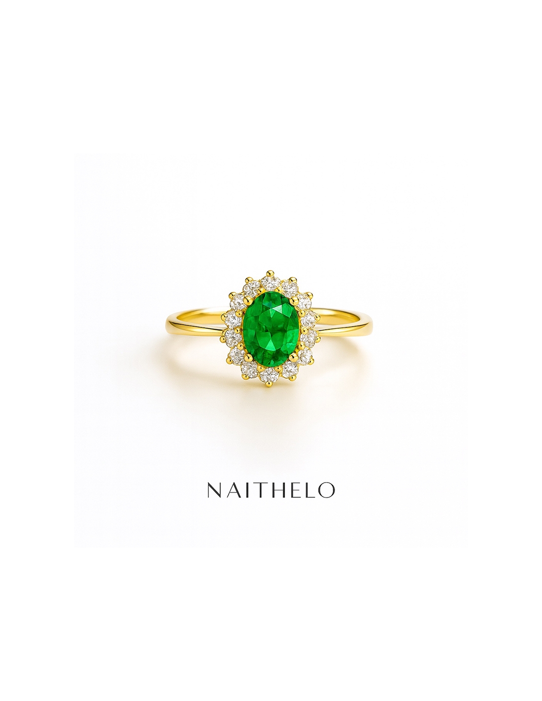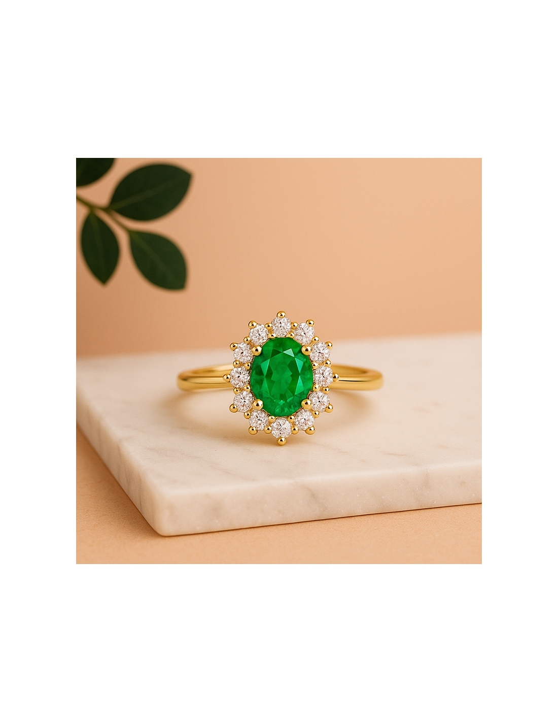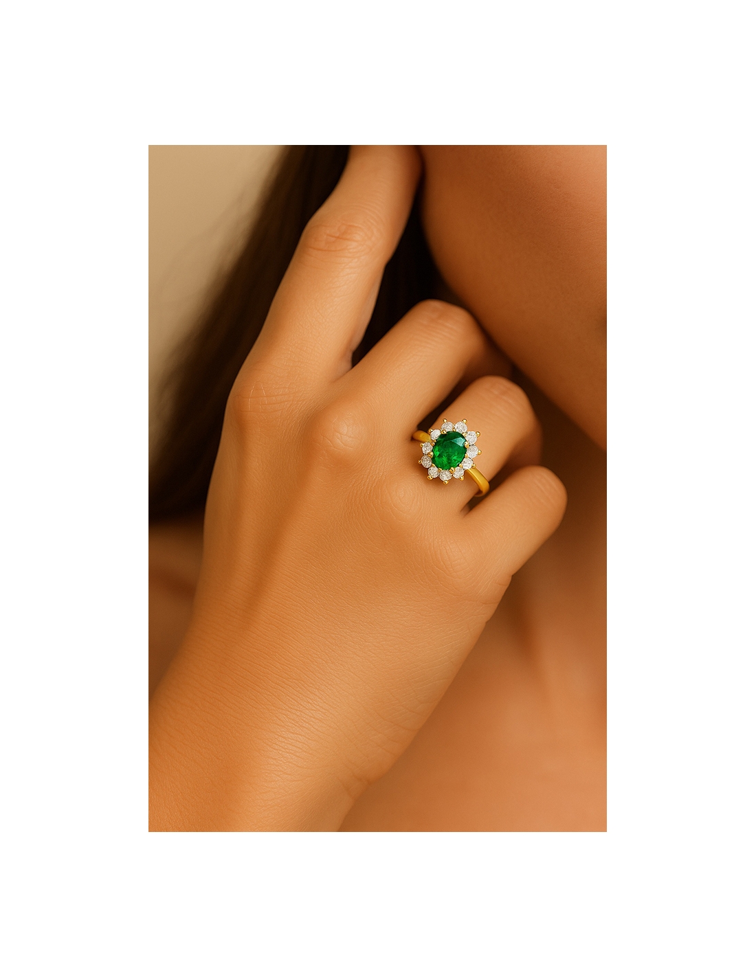 Descubre la magia de un diseño icónico con un toque exclusivo: anillo de compromiso estilo Lady Di, realzado con una impresionante Esmeralda ovalada en el centro. Su color verde intenso simboliza la esperanza, la armonía y el amor eterno, convirtiéndolo en una pieza inigualable. La piedra central está rodeada por un halo de Diamantes que multiplican su luminosidad, creando un contraste deslumbrante entre el verde profundo de la esmeralda y el resplandor del engaste. Diseño romántico, distinguido y absolutamente atemporal.