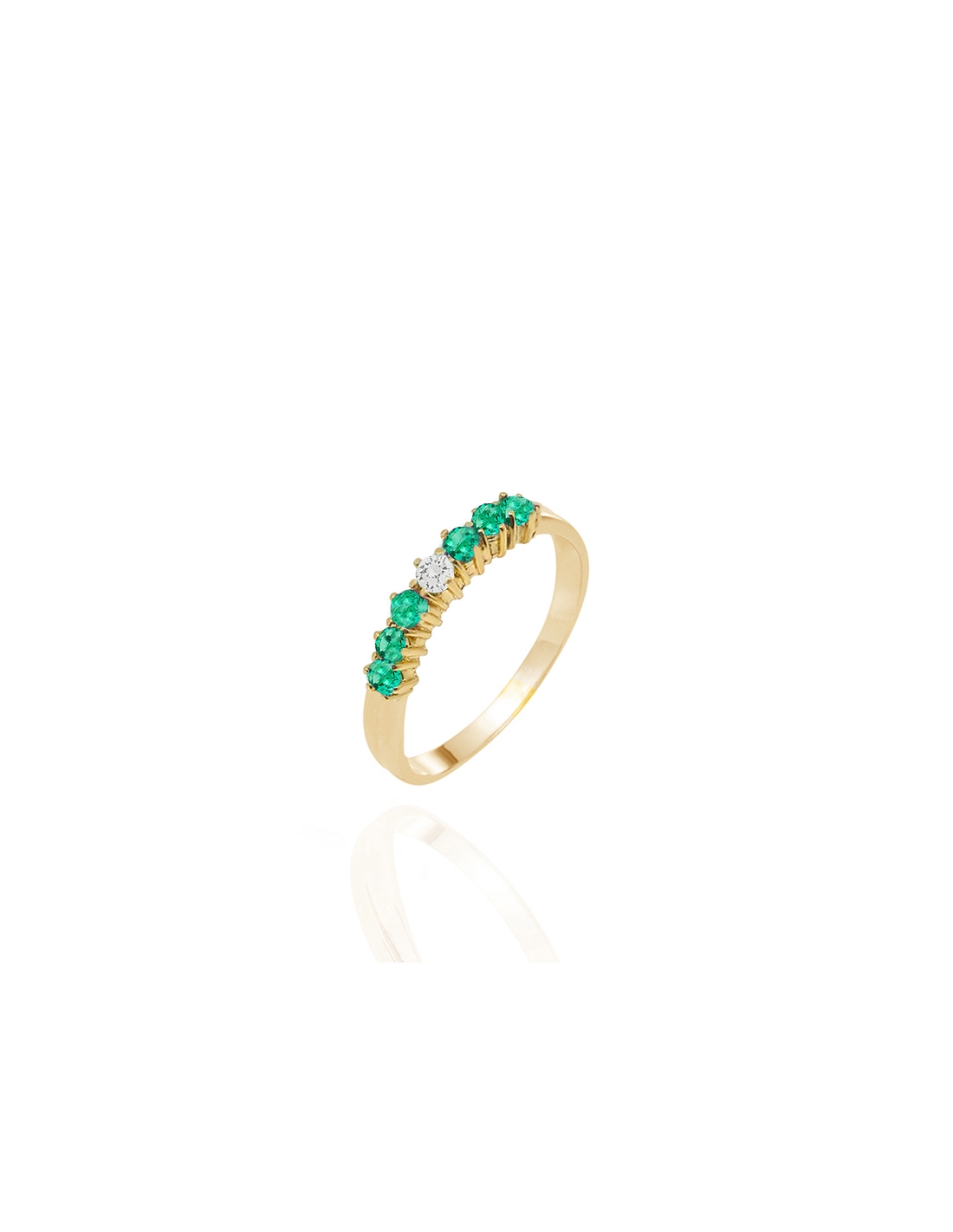 Anillo de oro amarillo de 18 quilates, con seis esmeraldas naturales de 2´5 mm incrustadas y un diamante de 3 mm certificado, de corte redondo y talla brillante. Una joya exquisita que será guardada y querida para siempre.